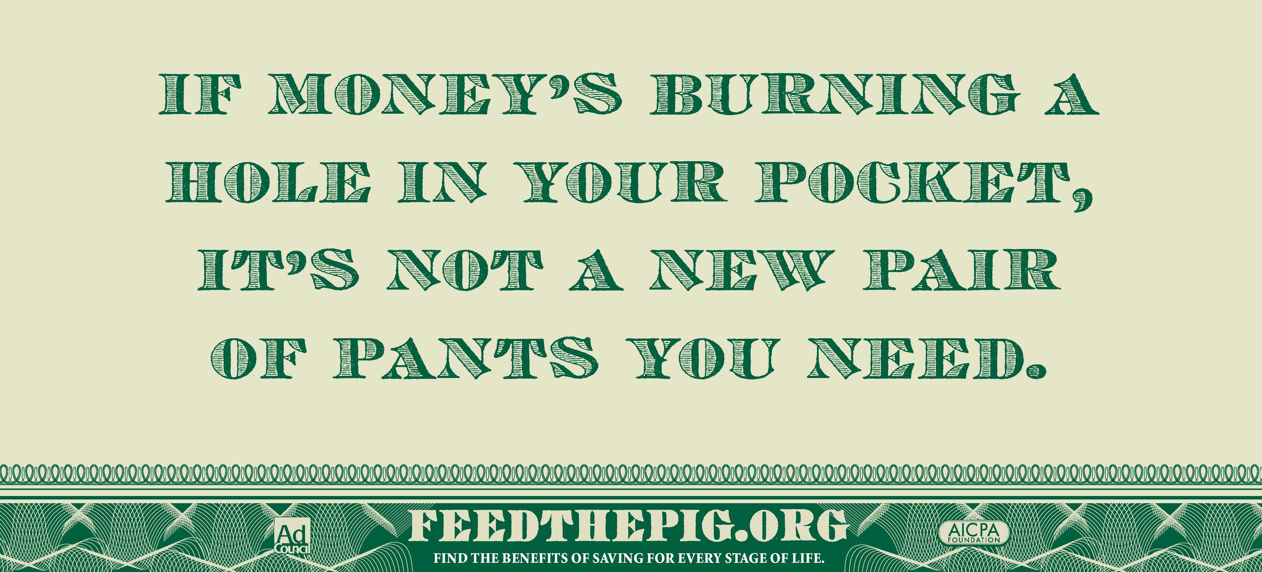 "Feed the Pig" is a national public service campaign by the American Institute of CPAs (AICPA) and the Ad Council to improve financial literacy, encouraging people to spend wisely and save more effectively. The campaign, primarily targeted those aged 25-34, using various mediums and resources like TV and radio ads, podcasts, OOH, print and online tools on its website, FeedThePig.org, to provide tips on saving and managing money.